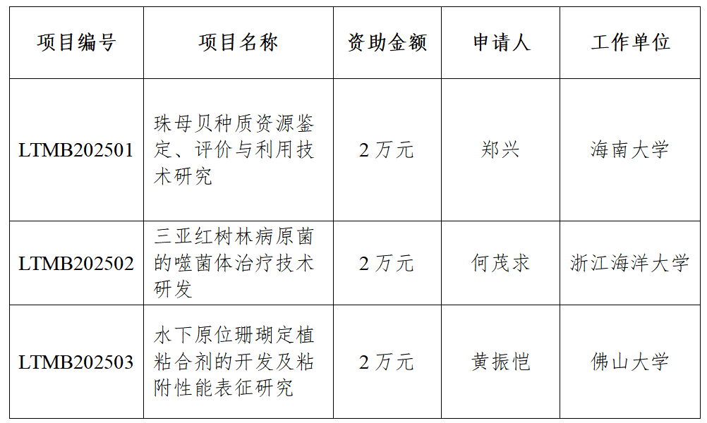 根据《海南省热带海洋生物技术重点实验室开放基金管理办法》,按照择优选取的原则,经重点实验室初审和审议,确定2025年度开放基金项目共资助3项,每项2万元,立项名单见下表,现予以公示。